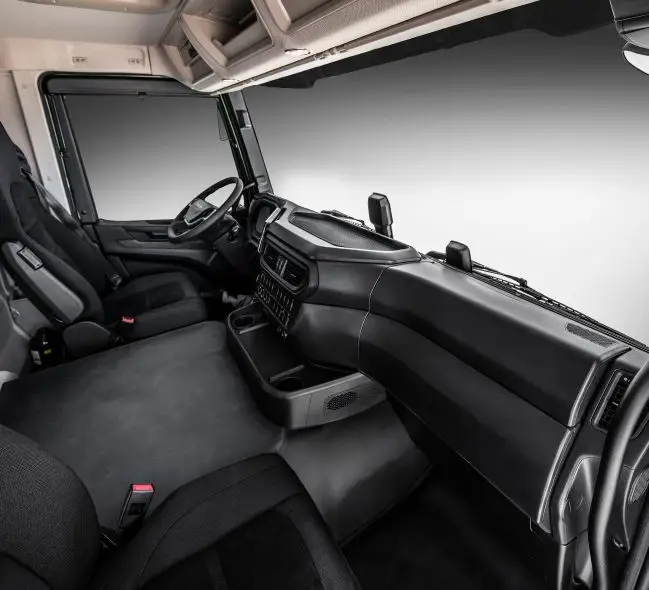 Комфортът на шофьора и пътника е гарантиран от избор на седалки, като всички са с пълна облегалка. Можете да избирате между винил или плат, отопление, въздушно окачване, опора за дървен материал и дори цвят на предпазните колани.