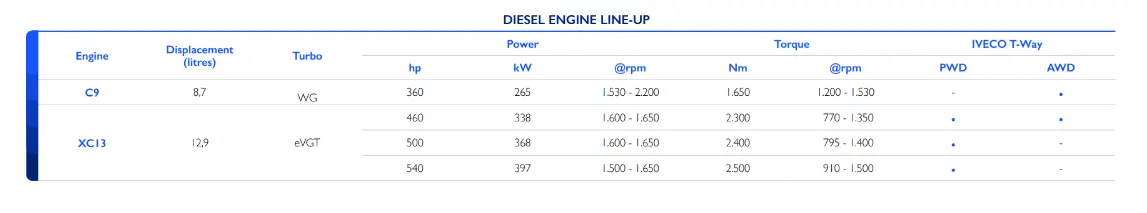 Предложението включва избор от двигатели с два обема от 9 и 13 литра, за да се осигурят идеалната мощност и въртящ момент, които са най-подходящи за вашата мисия.